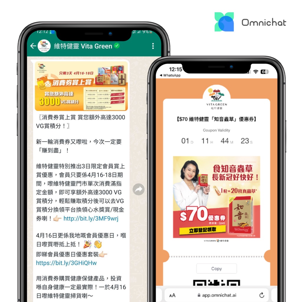 Coupons are one of the most prevalent ways to boost sales. By utilising Omnichat’s coupon module, they can design and distribute WhatsApp coupons to members and customers via Broadcast, enticing them to make purchases at physical stores. Terrance Siu of Vita Green Group believes that this approach allows the Group to maintain control over the distribution quantity and accurately target specific customer segments such as VIPs.