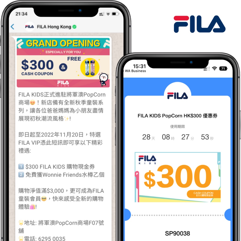 著重業務的可持續發展,FILA 除了穩固品牌線下零售基礎,也推動全渠道整合。FILA 提供 WhatsApp 優惠券作招徠,吸引 VIP 到訪 FILA 全新實體店,將流量從線上帶到線下。