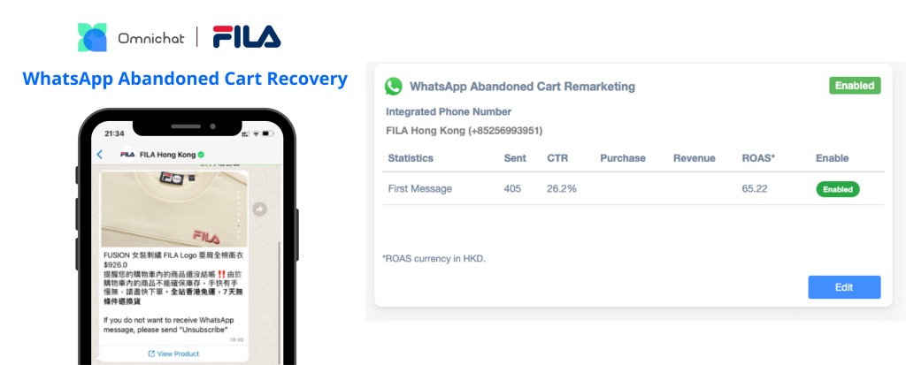 FILA 網站銷售錄得明顯增長,其中一個關鍵因素就是購物車再行銷功能。Omnichat 系統可於預定時間,自動發送購物車提示訊息至 WhatsApp,讓潛在客戶回心轉意,提高購物車結帳率。